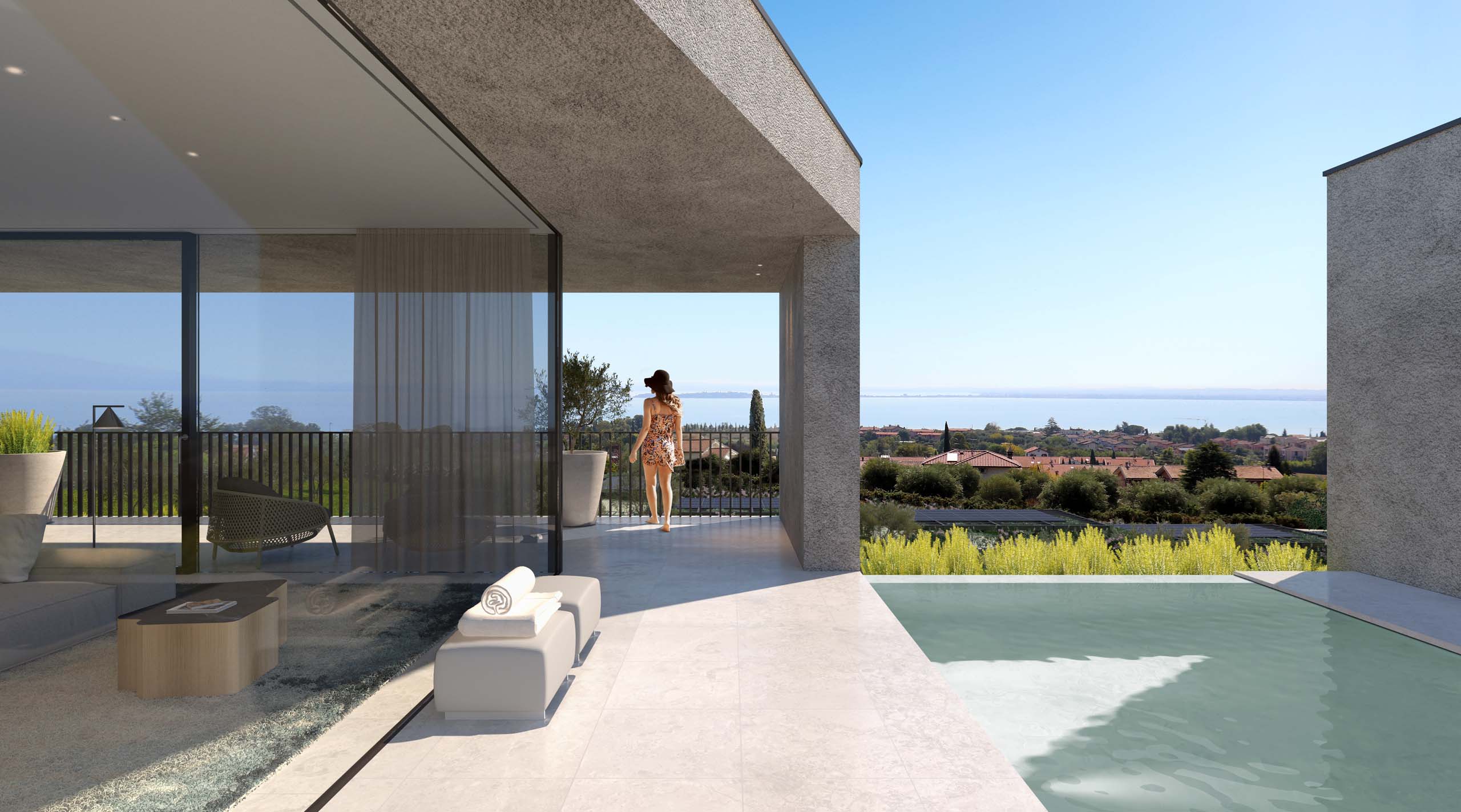 Esclusivo appartamento al primo piano con terrazza. Il cielo, la piscina e il Lago di Garda: la bellezza si tinge di azzurro.